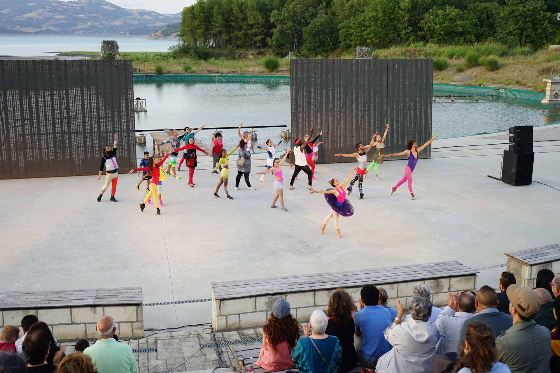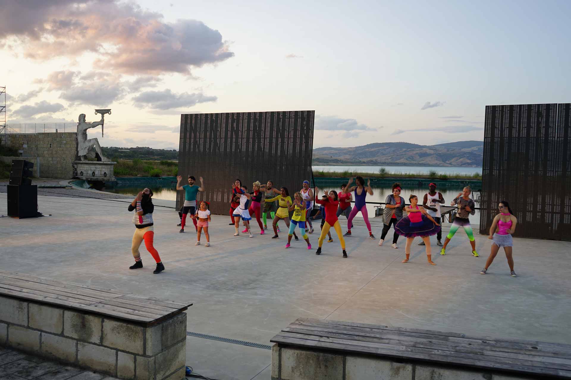 Anche questa mattina è satura di impegni, la riunione al MULA+ ha come oggetto la definizione di alcuni aspetti organizzativi in vista dello spettacolo che andrà in scena tra due giorni. Dal momento che stasera e domani si proverà fino alle 22.00 bisognerà provvedere alla cena al sacco per tutti i partecipanti: decidiamo, dietro suggerimento di Gaetano, per delle mozzarelle, pomodoro, salame, pane casereccio e uva. La scelta è stata dettata anche dal sondaggio, fatto il giorno prima, tra i componenti del cast; pensiamo, così, di accontentare anche i palati più esigenti. La mattinata prosegue e vengono inviate anche le ultime mail d'invito per lo spettacolo. Gaetano e il suo cellulare sono ormai inseparabili, i problemi tecnici non mancano e vanno risolti in un modo o nell'altro. In una cassetta riponiamo tutto ciò che potrebbe tornarci utile: forchette, piatti, tovaglioli, buste per la raccolta dell'umido etc., tutti prodotti rigorosamente biodegradabili e compostabili, com’è nello spirito di ArtePollino ma anche dello staff di Jérôme Bel che, ad esempio, da anni ha scelto di non viaggiare più in aereo preferendo il treno, molto meno inquinante. Superiamo anche il problema delle bottigliette di plastica con dei coloratissimi thermos dalla capienza di 3 o 6 litri d'acqua ciascuno che ci aiuteranno a dissetare gli stanchi e affaticati performer. Il giorno prima avevamo anche invitato ciascuno dei partecipanti a dotarsi di borraccia, se possibile. Insomma, tanti piccoli accorgimenti per provare, tutti insieme, a fare la nostra piccolissima parte e produrre meno rifiuti possibile. Alle 17.15 siamo a Senise. I primi ad arrivare sono ancora loro, Nicola e Cosima, ma, questa volta, senza quell'"affascinante" strumento musicale. Aspettiamo che arrivino tutti e ripartono le prove. Vengono subito definiti i “soli”. Ciascuno dei partecipanti, in base al protocollo fissato da Jérôme Bel, aveva in precedenza inviato una foto e un piccolo video, ma ieri Chiara aveva avuto modo di vedere ognuna delle singole esibizioni dal vivo. La timidezza dei performer piano piano viene meno, ben presto ci si sente bene, quasi come tra amici. Chiara li invita ripetutamente a lasciarsi andare esprimendosi liberamente, ad abbassare le difese e a squarciare quei veli di insicurezza di cui sono coperti. Durante le singole performance non bisogna imitare il passo del solista ma rappresentarlo a modo proprio, non occorre lo "sguardo periferico", tutta sta nell'improvvisazione. Le interruzioni sono tante, i consigli di Chiara necessari. Gaetano si diverte a fare qualche foto. Il tramonto con le sue sfumature arancio, blu e rosa chiaro ci emoziona. I colli ci abbracciano, il verde delle campagne si riflette nelle acque della diga, tra le più grandi in Europa con sbarramento in terra battuta. L'attenzione a un certo punto si concentra su Gabriele C. che ci cattura con la sua esibizione: il pezzo che ha scelto è l'intramontabile e travolgente "I want you break free" dei Queen. Dopo l'incontro con una biscia d’acqua, che sguazzava felice nella diga, ci è venuta fame; mangiamo qualcosa e, chiacchierando, ci conosciamo tutti un po’ meglio. Dopo qualche chicco d'uva, i performer tornano a danzare. Le prove proseguono fino a tardi, Chiara fa su e giù dalle scale di continuo per dispensare indicazioni: dall'alto soltanto si riesce ad avere una giusta visione d'insieme. Tra l'altro, a causa di alcuni problemi tecnici, il palco stasera è illuminato solo da piccoli faretti che rendono un po’ precari i movimenti. A fine serata siamo tutti distrutti. I vestiti si sono inevitabilmente sgualciti, alcuni addirittura bucati e la polvere, rilasciata dalla superficie su cui i performer hanno provato, li ha resi di una colorazione biancastra. Una lavatrice risolverà ogni problema e i buchi renderanno quei vestiti "più vissuti", forse. Oggi abbiamo conosciuto God’spower: un nome, una promessa. Per tutti God’s è un ragazzo arrivato in Italia dalla Nigeria alcuni anni fa; ben inserito, un grande lavoratore con una forte passione per il ballo; ha deciso di partecipare alle prove e di esibirsi con noi. Lo accogliamo, facciamo amicizia. Il cast può dirsi finalmente al completo. Ci salutiamo, si è fatto tardi e alcuni, per rientrare a casa, dovranno affrontare il viaggio. Altri, quelli del posto, si danno appuntamento a un pool party lì vicino; per il resto della compagnia il vero party sarà a letto. Ad esempio per noi.