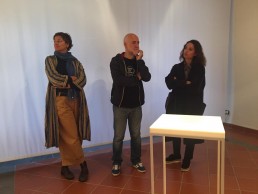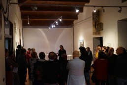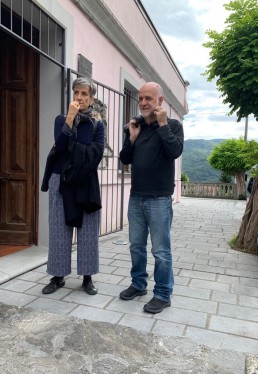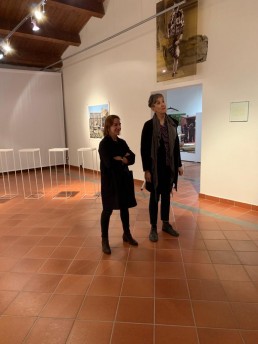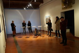 Bora sarebbe arrivata puntuale al museo, come da accordi, ma stamattina Luca, che doveva andare a prenderla, e che di solito arriva in orario, ha pensato di lasciarla in febbrile attesa ancora per un po’ e si è presentato in leggero ritardo. Ma appena arrivati, neppure il tempo di un caffè, e già sono all’opera, sul terrazzo del museo, per la seconda mano di pitturazione. Il risultato, alla fine, sarà molto gradevole. Di lì a poco ci raggiunge anche il resto del gruppo per gli ultimi ritocchi, qualche foto, la regolazione finale del video. Dovrebbe essere tutto a posto. Manca solo la piantina del museo, con l’indicazione della posizione esatta delle opere, da stampare e consegnare ai visitatori, ma a questo penserà Luca tra un po’. Oggi, per pranzo, siamo da Daniela. L’abbondante antipasto basterebbe ma la golosità spinge ad andare un po’ oltre: arriviamo fino all’assaggio di pasta, che assaggio non è, e poi direttamente al caffè. Ci lasciamo per un’oretta circa, il tempo di riassestarci. Alle 18.00, puntuali, arrivano i primi visitatori e il piacere è grande nel vedere, insieme agli altri, proprio lui, Quirino. E subito dopo Essa e Mustapha. Due delle opere esposte parlano di loro. Nei giorni precedenti li avevamo sentiti e invitati, in virtù dell’affetto e della stima che ci lega a queste persone, ma non eravamo sicuri della loro presenza, e invece eccoli qui. E pian piano vediamo arrivare tante persone che seguono con costanza le attività dell’associazione; non solo persone di Latronico, ma anche di Lauria, Francavilla sul Sinni, Cersosimo, Viggianello, San Costantino Albanese e molti altri paesi dell’area, oltre agli immancabili Agnese e Antonio partiti da Rionero in Vulture. Qualche parola da parte di Katia, Claudia e Rosita per illustrare agli ospiti i lavori e il senso della residenza e della mostra, poi, rievocando (ma solo nel nome) l’antica arte degli àuguri, si brinda tutti insieme affinché il buon auspicio accompagni le opere e gli artisti “Del tempo fossile”.