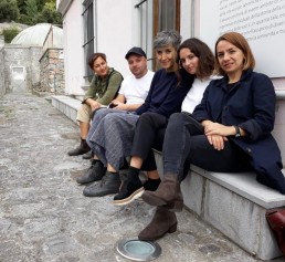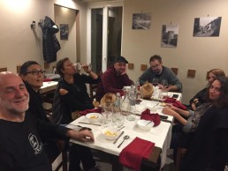 È il compleanno di Gaetano e, per il secondo anno consecutivo, in questa data, ci ritroviamo a lavorare per Ka art. Esattamente un anno fa eravamo insieme a Elvira Dones, Marco Cazzato, Elena Notarangelo e Anastasia Frandino, impegnati nel cammino d’autore Ritratti di Umanità. Non possiamo non ricordarci anche di loro in questo giorno e del tempo trascorso insieme. Anche per Katia, questa mattina, uno dei primi pensieri è stato il compleanno di Gaetano. Appena uscita dal B&B si è recata nel bar chalet, all’ingresso del paese e lì, con il suo fascino ammaliante, è riuscita a coinvolgere tutti gli avventori nella scelta del regalo. Purtroppo abbiamo qualcosa di impellente nel nostro programma giornaliero e rinviamo il festeggiamento a questa sera, quando saremo tutti insieme. La prima ad arrivare, nel pomeriggio, è Silva, con nostra grande sorpresa: l’aereo è arrivato a Napoli in anticipo e lei è riuscita a prendere l’autobus che partiva alle 14.00. A seguire Bora e Pleurad e, infine, Claudia. Camilla e Cosimo, purtroppo, questa volta non saranno con noi. Mancherà anche Francesco che, insieme a Claudia, ha seguito la residenza e i lavori. Sono passati pochi minuti da quando è entrata nel museo e l’occhio di Bora è già caduto sulle rifiniture della pitturazione dei supporti in acciaio. Per qualche minuto Bora valuta la possibilità di restare chiusa al museo questa sera, invece di venire con noi a cena, per dare una seconda mano. Poi gli sfottò di tutti la convincono a rimandare a domani mattina. Ma da quel momento il refrain della serata sarà quello. Trascorriamo almeno un’ora e mezza tra un faretto e l’altro: “alza un po’”, “abbassa”, “sposta leggermente a destra”, “quello a luce calda più a sinistra”, “mhmm troppe ombre”, “peccato, questo pavimento non è il massimo” ecc. Tutti con lo sguardo all’insù, poi in giù, la testa inclinata da un lato e poi dall’altro, la mano a reggere il mento, mentre Gaetano e Luca salgono e scendono da una scala in base alle indicazioni che vengono dal basso. E’ lo stimolo della fame a decretare lo scioglimento dei lavori. Mezz’ora e ci ritroviamo da Emidio, in una sala strapiena di gente, seduti in mezzo a centinaia (sic!) persone che hanno deciso di trascorrere il sabato sera al ristorante guardando la partita: stasera se la giocano Genoa e Milan. Mangiamo e chiacchieriamo ma la stanchezza serpeggia e, soprattutto, si fa una gran fatica ad ascoltarsi con questo vocio in sottofondo. Perciò, dopo un dolce e un brindisi alla salute di Gaetano, e dopo una foto demenziale per sentirci più leggeri, si va a letto.