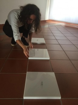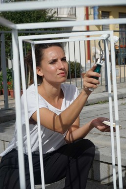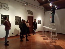Passiamo a prendere Katia al B&B. Una sosta al bar per il caffè e poi subito a lavoro. Vogliamo che sia tutto pronto, domani sera, quando arriveranno gli artisti e Claudia, la tutor della residenza, o visiting professor com’è più corretto dire. Il MULA+ è pronto ad accogliere la mostra Del tempo fossile, l’ultima delle tante azioni che insieme sono andate a comporre la cartografia corale di Ka art. Un percorso lungo un anno: dieci appuntamenti, sette luoghi toccati tra il Pollino e Matera, sedici artisti e venti danzatori, tantissime persone coinvolte. Anche per questa mostra, nei giorni precedenti, è stato fatto un grande lavoro. Già a luglio, quando ci eravamo riuniti con Luca e Katia, avevamo stabilito dove ciascuna della cinque opere avrebbe trovato posto. Nei mesi successivi, una alla volta, le opere sono state spedite e sono arrivate a noi. Ma all’atto pratico c’è sempre qualcosa da rivedere. Ci confrontiamo e dopo un po’ possiamo avviare l’allestimento. Nei giorni scorsi Luca è stato impegnato a seguire il lavoro di Santino, fabbro di rara maestria, che ha realizzato cinque supporti in acciaio per l’opera di Bora e oggi possiamo pitturarli di bianco (così ha deciso ieri l’artista, noi li avremmo lasciati neri). Il gruppo di lavoro si divide velocemente: chi si occupa di prendere misure, chi delle foto, chi di reperire delle clip, chi di fissare i tasselli al muro, chi del video, chi di pitturare e chi delle didascalie. La mattinata e il pomeriggio vanno via così. A sera facciamo una valutazione: il lavoro ormai è a buon punto, si tratta di definire alcuni dettagli. Domani saremo pronti.
