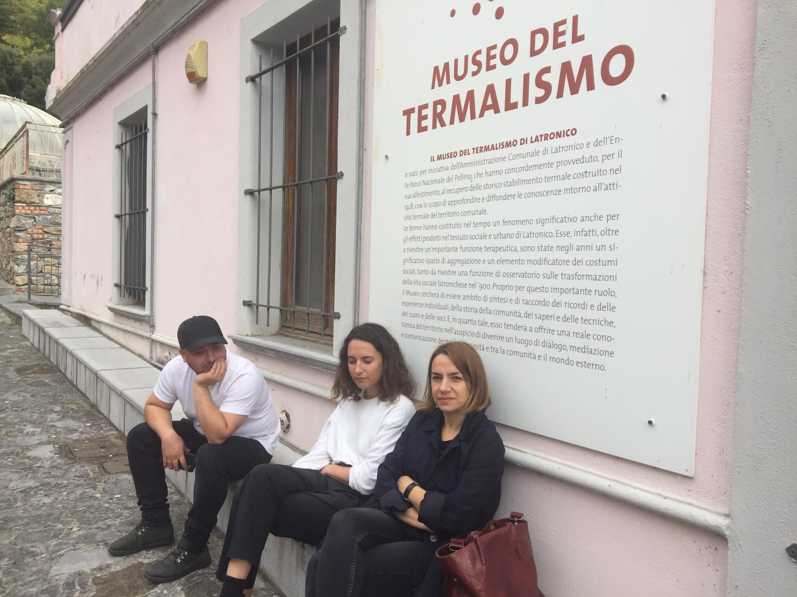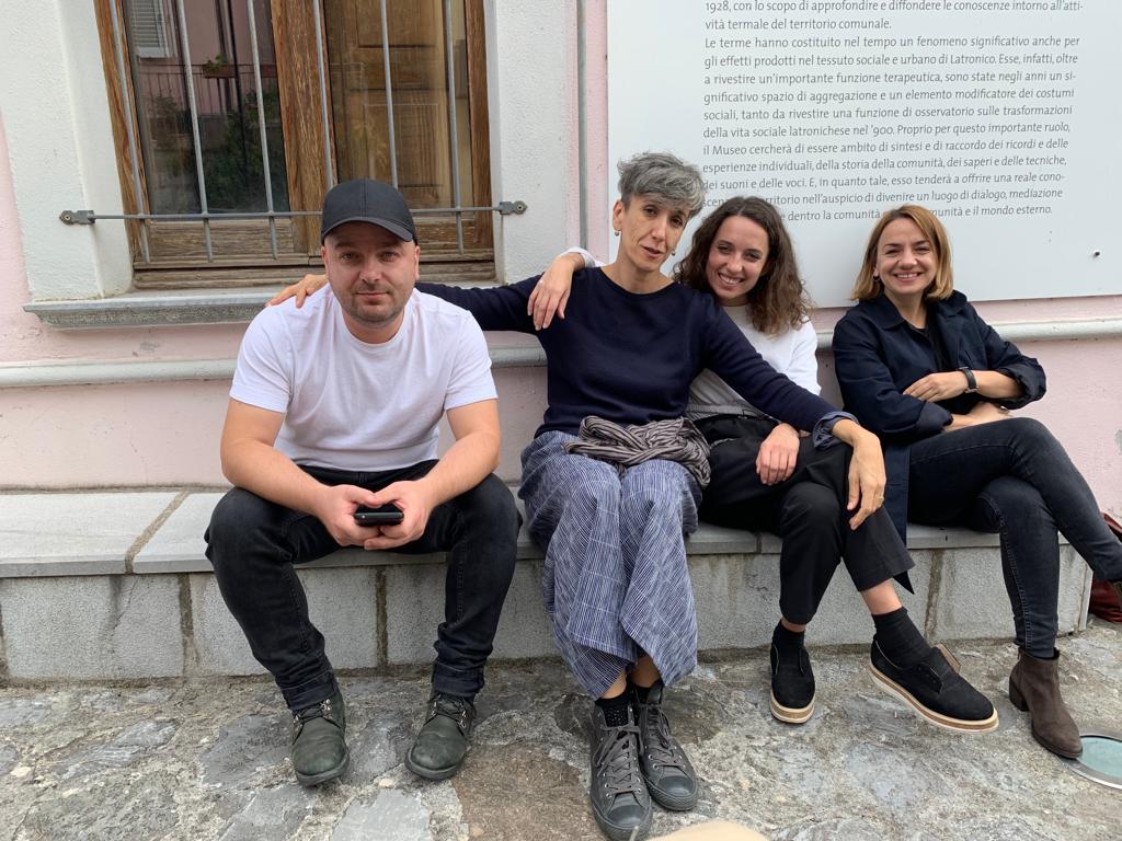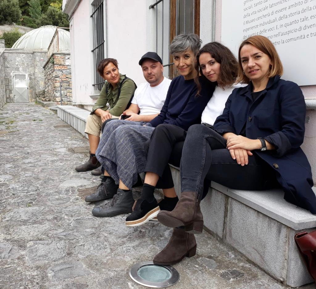 È il compleanno di Gaetano e, per il secondo anno consecutivo, in questa data, ci ritroviamo a lavorare per Ka art. Esattamente un anno fa eravamo insieme a Elvira Dones, Marco Cazzato, Elena Notarangelo e Anastasia Frandino, impegnati nel cammino d’autore Ritratti di Umanità. Non possiamo non ricordarci anche di loro in questo giorno e del tempo trascorso insieme. Anche per Katia, questa mattina, uno dei primi pensieri è stato il compleanno di Gaetano. Appena uscita dal B&B si è recata nel bar chalet, all’ingresso del paese e lì, con il suo fascino ammaliante, è riuscita a coinvolgere tutti gli avventori nella scelta del regalo. Purtroppo abbiamo qualcosa di impellente nel nostro programma giornaliero e rinviamo il festeggiamento a questa sera, quando saremo tutti insieme. La prima ad arrivare, nel pomeriggio, è Silva, con nostra grande sorpresa: l’aereo è arrivato a Napoli in anticipo e lei è riuscita a prendere l’autobus che partiva alle 14.00. A seguire Bora e Pleurad e, infine, Claudia. Camilla e Cosimo, purtroppo, questa volta non saranno con noi. Mancherà anche Francesco che, insieme a Claudia, ha seguito la residenza e i lavori. Sono passati pochi minuti da quando è entrata nel museo e l’occhio di Bora è già caduto sulle rifiniture della pitturazione dei supporti in acciaio. Per qualche minuto Bora valuta la possibilità di restare chiusa al museo questa sera, invece di venire con noi a cena, per dare una seconda mano. Poi gli sfottò di tutti la convincono a rimandare a domani mattina. Ma da quel momento il refrain della serata sarà quello. Trascorriamo almeno un’ora e mezza tra un faretto e l’altro: “alza un po’”, “abbassa”, “sposta leggermente a destra”, “quello a luce calda più a sinistra”, “mhmm troppe ombre”, “peccato, questo pavimento non è il massimo” ecc. Tutti con lo sguardo all’insù, poi in giù, la testa inclinata da un lato e poi dall’altro, la mano a reggere il mento, mentre Gaetano e Luca salgono e scendono da una scala in base alle indicazioni che vengono dal basso. E’ lo stimolo della fame a decretare lo scioglimento dei lavori. Mezz’ora e ci ritroviamo da Emidio, in una sala strapiena di gente, seduti in mezzo a centinaia (sic!) persone che hanno deciso di trascorrere il sabato sera al ristorante guardando la partita: stasera se la giocano Genoa e Milan. Mangiamo e chiacchieriamo ma la stanchezza serpeggia e, soprattutto, si fa una gran fatica ad ascoltarsi con questo vocio in sottofondo. Perciò, dopo un dolce e un brindisi alla salute di Gaetano, e dopo una foto demenziale per sentirci più leggeri, si va a letto.