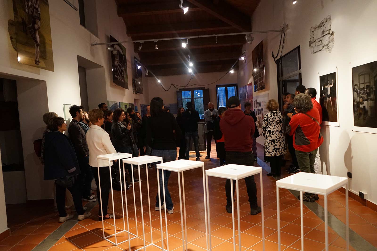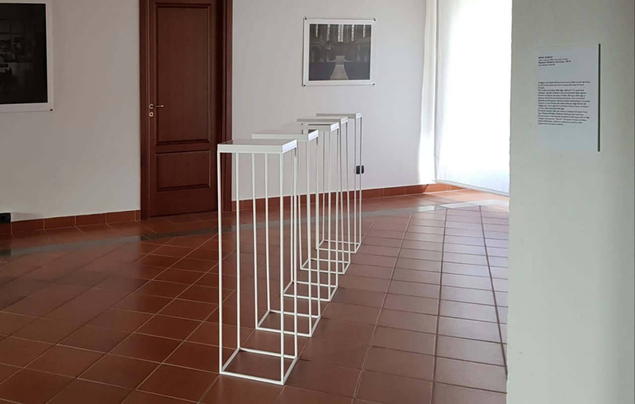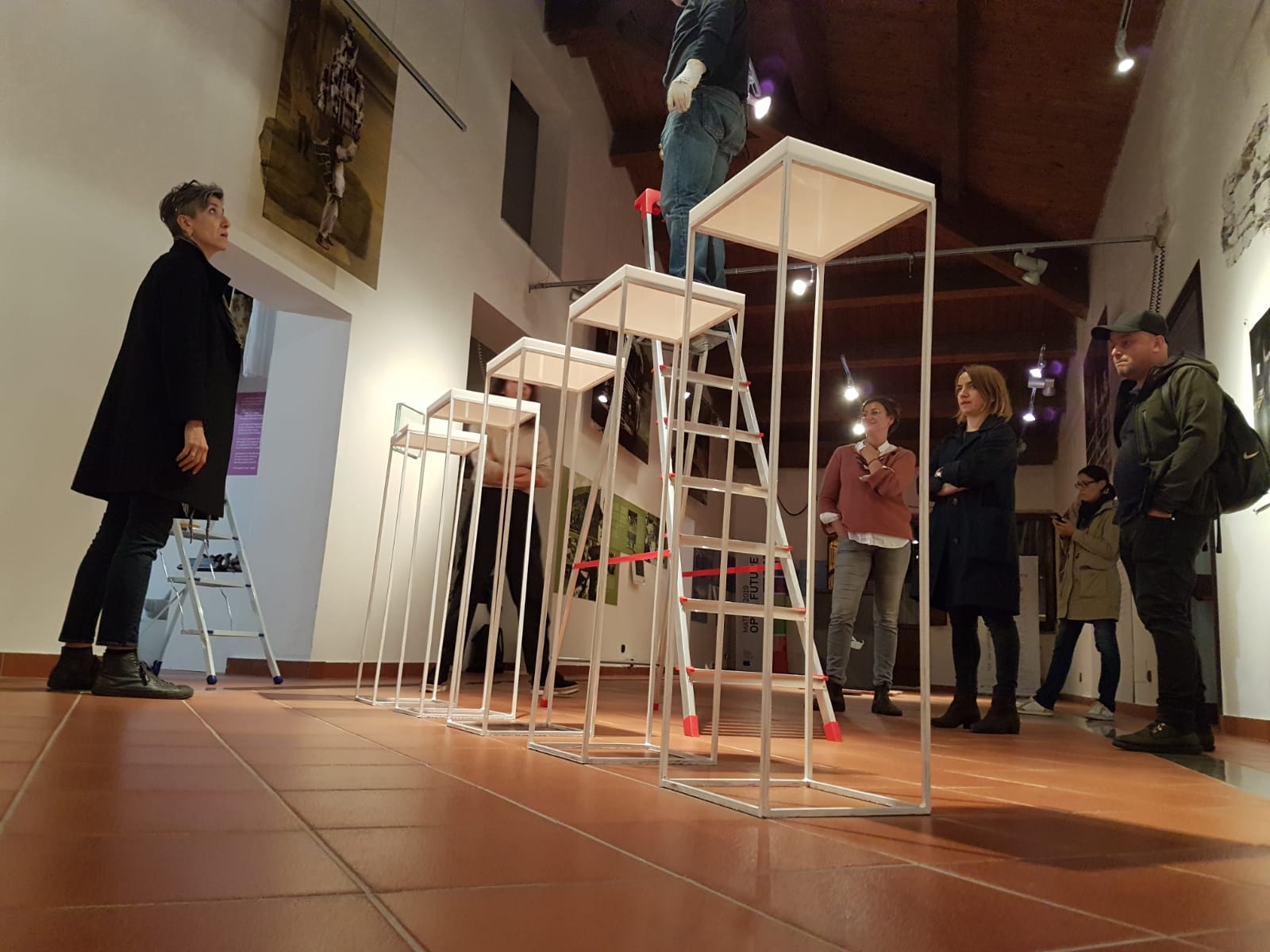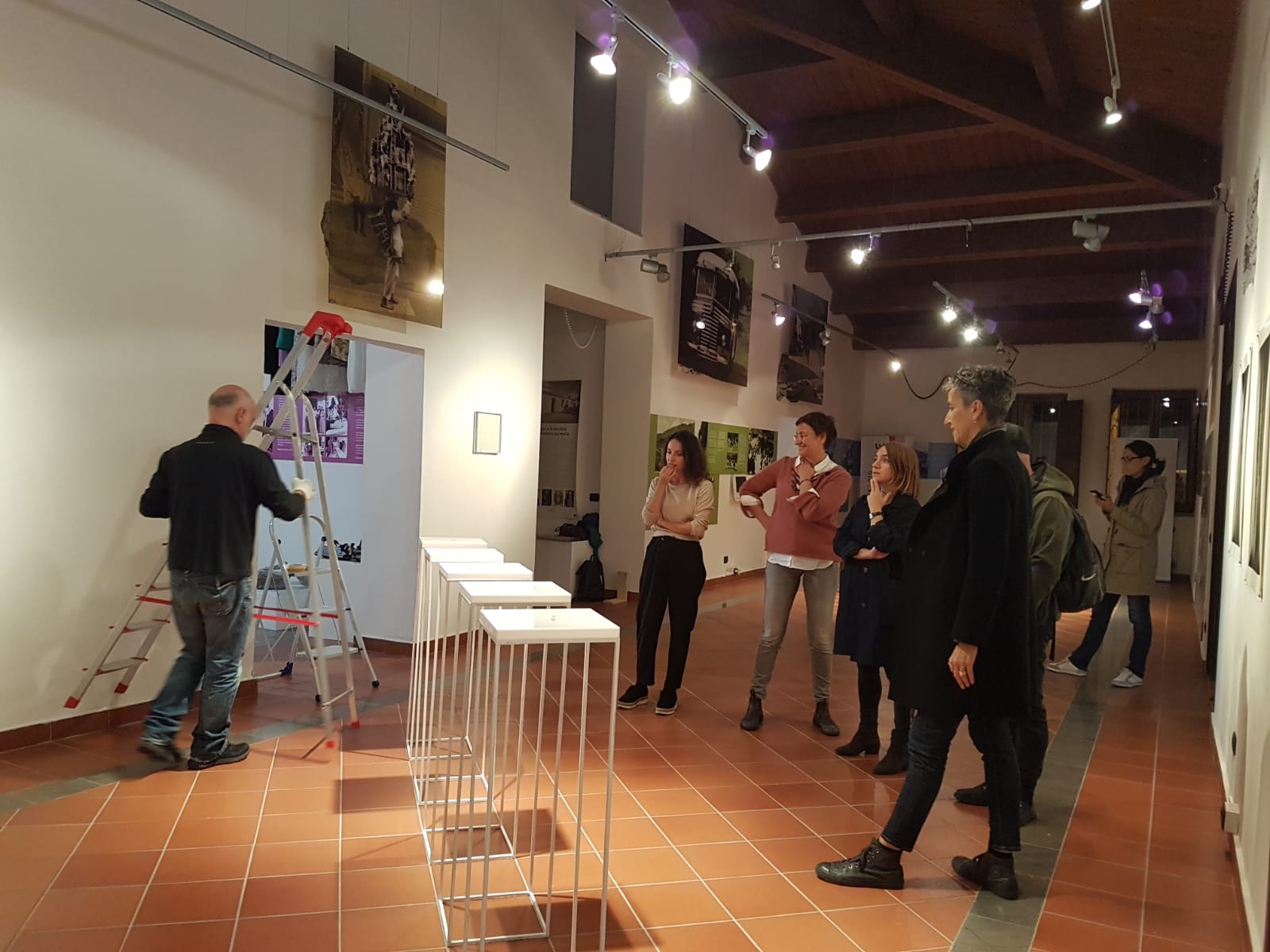 Passiamo a prendere Katia al B&B. Una sosta al bar per il caffè e poi subito a lavoro. Vogliamo che sia tutto pronto, domani sera, quando arriveranno gli artisti e Claudia, la tutor della residenza, o visiting professor com’è più corretto dire. Il MULA+ è pronto ad accogliere la mostra Del tempo fossile, l’ultima delle tante azioni che insieme sono andate a comporre la cartografia corale di Ka art. Un percorso lungo un anno: dieci appuntamenti, sette luoghi toccati tra il Pollino e Matera, sedici artisti e venti danzatori, tantissime persone coinvolte. Anche per questa mostra, nei giorni precedenti, è stato fatto un grande lavoro. Già a luglio, quando ci eravamo riuniti con Luca e Katia, avevamo stabilito dove ciascuna della cinque opere avrebbe trovato posto. Nei mesi successivi, una alla volta, le opere sono state spedite e sono arrivate a noi. Ma all’atto pratico c’è sempre qualcosa da rivedere. Ci confrontiamo e dopo un po’ possiamo avviare l’allestimento. Nei giorni scorsi Luca è stato impegnato a seguire il lavoro di Santino, fabbro di rara maestria, che ha realizzato cinque supporti in acciaio per l’opera di Bora e oggi possiamo pitturarli di bianco (così ha deciso ieri l’artista, noi li avremmo lasciati neri). Il gruppo di lavoro si divide velocemente: chi si occupa di prendere misure, chi delle foto, chi di reperire delle clip, chi di fissare i tasselli al muro, chi del video, chi di pitturare e chi delle didascalie. La mattinata e il pomeriggio vanno via così. A sera facciamo una valutazione: il lavoro ormai è a buon punto, si tratta di definire alcuni dettagli. Domani saremo pronti.