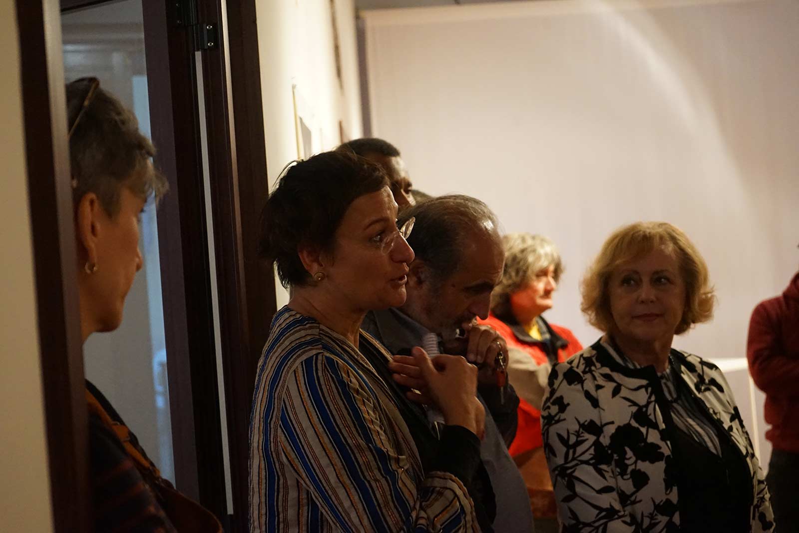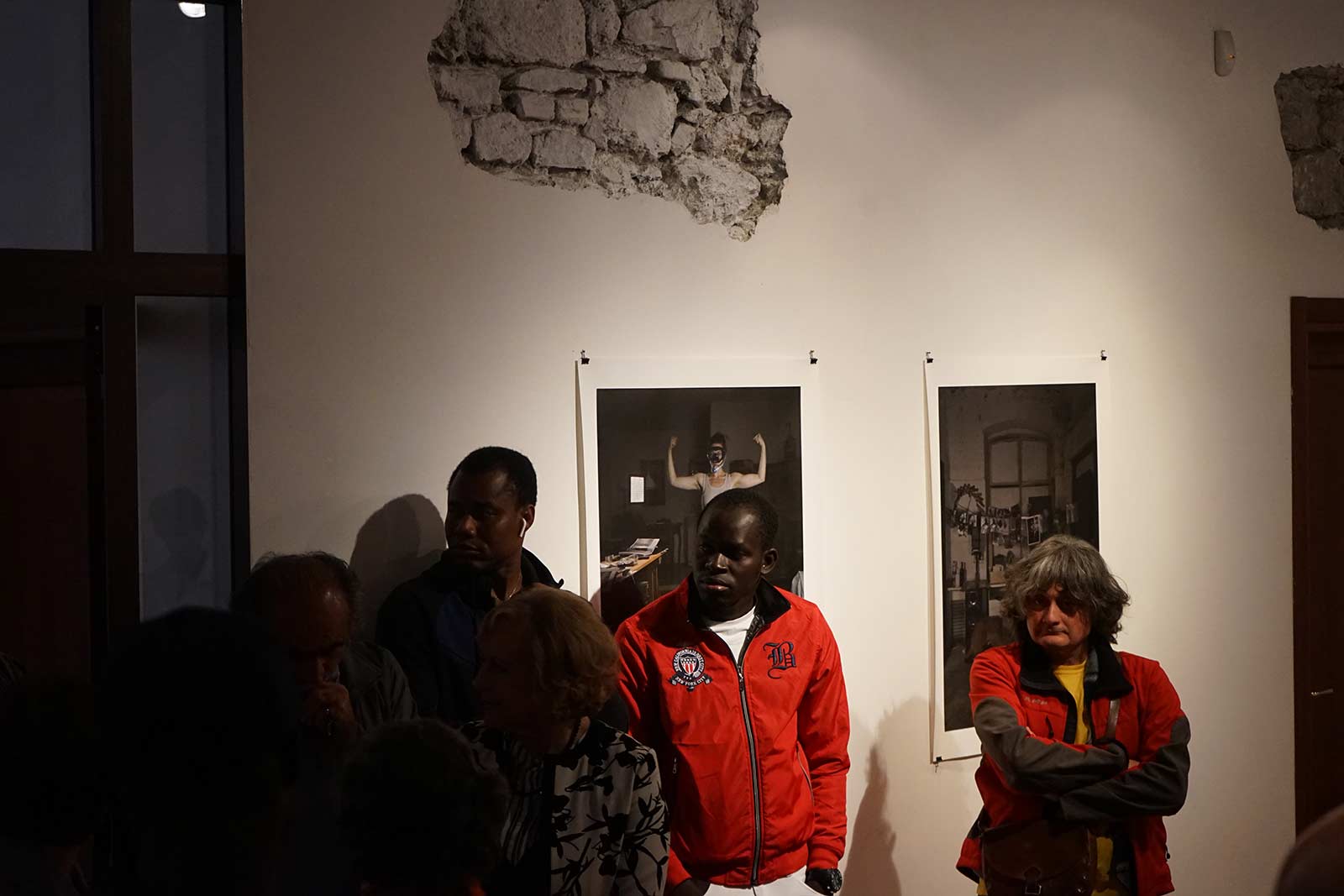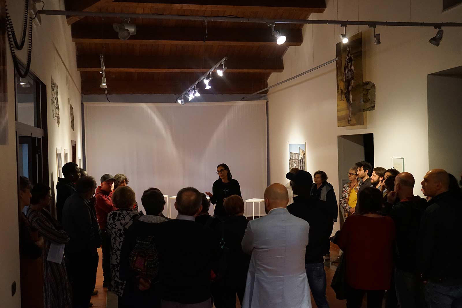 Bora sarebbe arrivata puntuale al museo, come da accordi, ma stamattina Luca, che doveva andare a prenderla, e che di solito arriva in orario, ha pensato di lasciarla in febbrile attesa ancora per un po’ e si è presentato in leggero ritardo. Ma appena arrivati, neppure il tempo di un caffè, e già sono all’opera, sul terrazzo del museo, per la seconda mano di pitturazione. Il risultato, alla fine, sarà molto gradevole. Di lì a poco ci raggiunge anche il resto del gruppo per gli ultimi ritocchi, qualche foto, la regolazione finale del video. Dovrebbe essere tutto a posto. Manca solo la piantina del museo, con l’indicazione della posizione esatta delle opere, da stampare e consegnare ai visitatori, ma a questo penserà Luca tra un po’. Oggi, per pranzo, siamo da Daniela. L’abbondante antipasto basterebbe ma la golosità spinge ad andare un po’ oltre: arriviamo fino all’assaggio di pasta, che assaggio non è, e poi direttamente al caffè. Ci lasciamo per un’oretta circa, il tempo di riassestarci. Alle 18.00, puntuali, arrivano i primi visitatori e il piacere è grande nel vedere, insieme agli altri, proprio lui, Quirino. E subito dopo Essa e Mustapha. Due delle opere esposte parlano di loro. Nei giorni precedenti li avevamo sentiti e invitati, in virtù dell’affetto e della stima che ci lega a queste persone, ma non eravamo sicuri della loro presenza, e invece eccoli qui. E pian piano vediamo arrivare tante persone che seguono con costanza le attività dell’associazione; non solo persone di Latronico, ma anche di Lauria, Francavilla sul Sinni, Cersosimo, Viggianello, San Costantino Albanese e molti altri paesi dell’area, oltre agli immancabili Agnese e Antonio partiti da Rionero in Vulture. Qualche parola da parte di Katia, Claudia e Rosita per illustrare agli ospiti i lavori e il senso della residenza e della mostra, poi, rievocando (ma solo nel nome) l’antica arte degli àuguri, si brinda tutti insieme affinché il buon auspicio accompagni le opere e gli artisti “Del tempo fossile”.